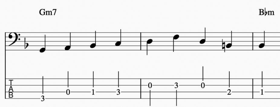これだけで、その次の小節、B♭m7へのアプローチも自然と変わり、ライン全体の印象も大きく変わります。