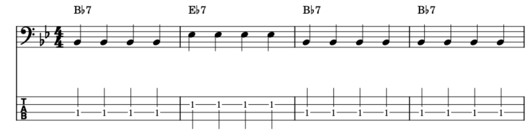 まずは、ルート音だけでしっかりと四分音符を刻めるようにしましょう。1音1音の長さと音量をそろえることが大切です。
