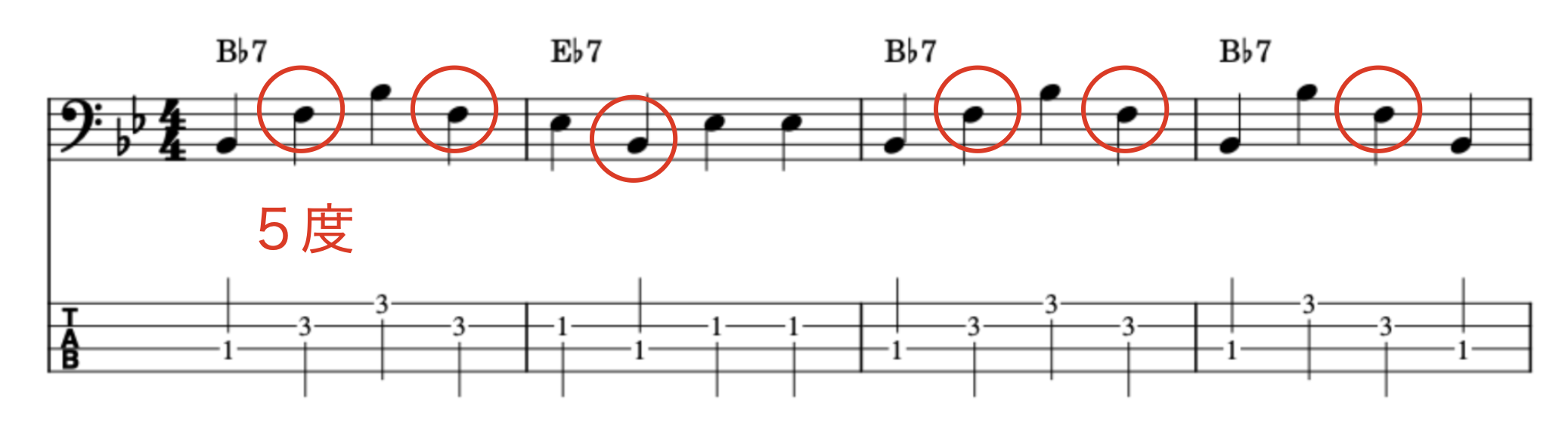 ここで、5度の音を加えてみましょう。ルート音とオクターブの間に5度を入れることで、音に厚みが生まれ、ラインに躍動感が出ます。