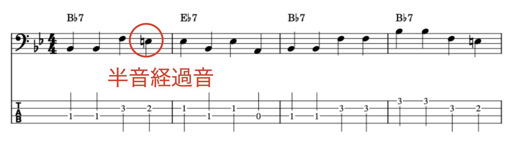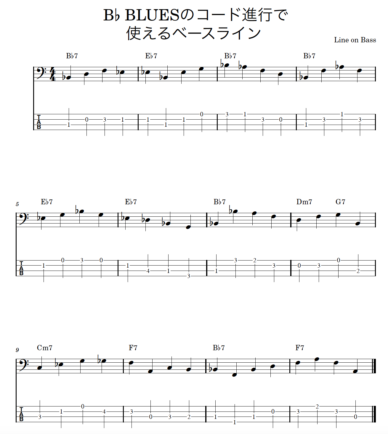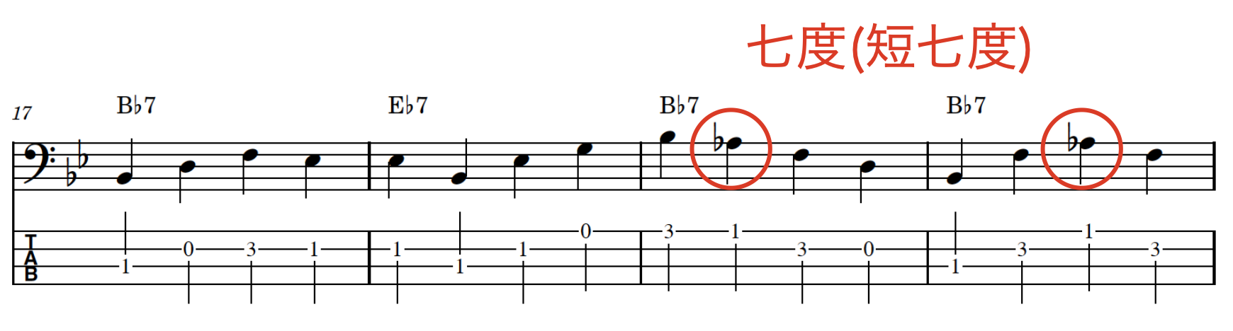 7度を取り入れて12小節のベースラインを組み立ててみました。このような感じになります。